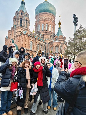 台湾后生在哈尔滨索菲亚教堂前合影(黑龙江省台联供图)