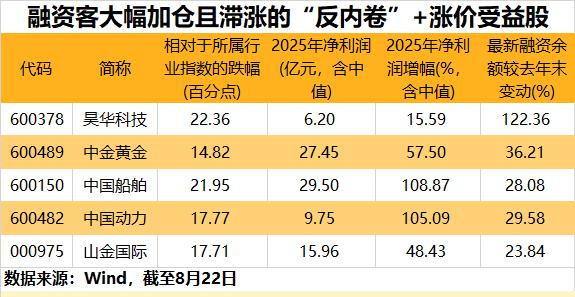 筹办行业来看,“反内卷”+加价受益股中,放胆8月22日,年内跑输所属的申万行业,且最新融资余额较客岁末加仓幅度跨越20%的个股仅有5只,按照加仓幅度排序,别离为昊华科技、中金黄金、中国船舶、中国能源、山金海外,其中昊华科技获融资客加仓跨越120%。