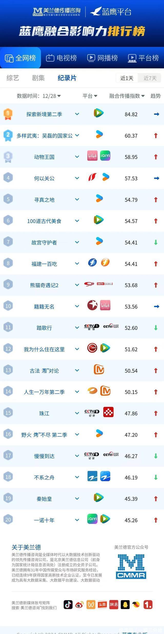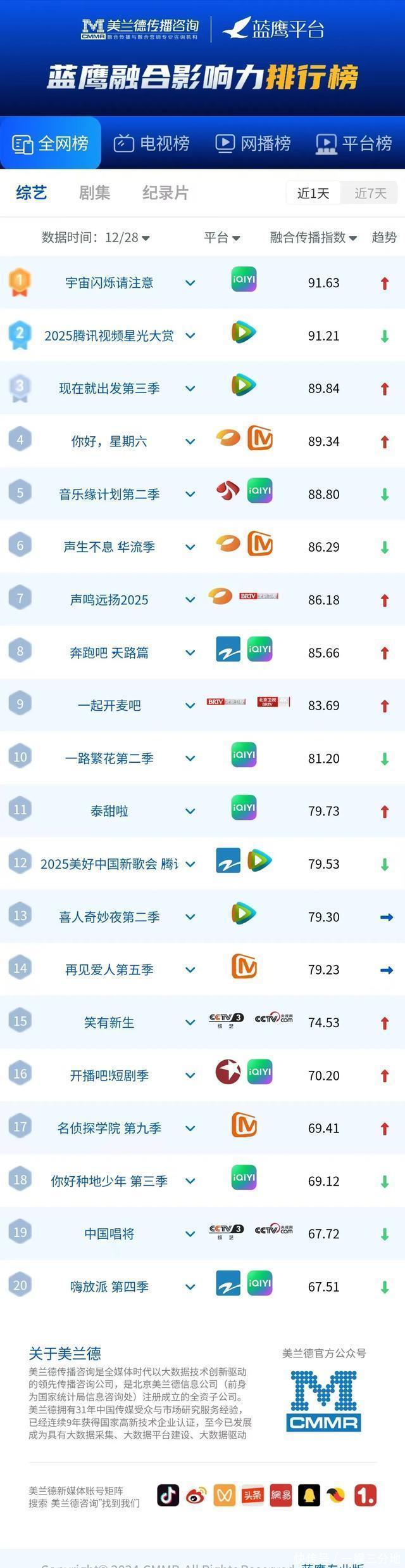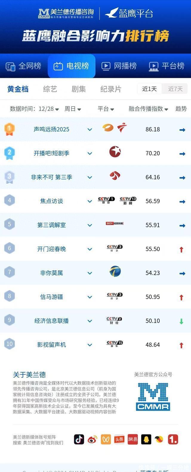 逐日亮点实质推介 《声鸣远扬2025》 昨日在 湖南卫视、北京卫视、江苏卫视、广东卫视、辽宁卫视、新疆卫视、芒果TV、腾讯视频 八大平台连合播出更新欧洲杯体育,本期通过7进6淘汰赛角逐世界6强与登上湖南卫视芒果TV跨年演唱会经历,选手凭借摇滚、探戈、民谣等多元曲风间碰撞,高光舞台不休,备受赞好意思。节目昨日好意思誉度98.03欧洲杯体育,位列晚间黄金档电视节目和会传播指数榜第一。 东方卫视《开播吧!短剧季》 昨日收官,节目将经典IP改编、高能游戏与严肃的饰演商量相合并,以剧综和会的形状与短剧饰演专科化理念,焕新受众对短剧艺术形状的领路,多元折射行业生态,展现短剧“杰作化”硕果与主流媒体新行动。节目昨日好意思誉度98.75,位列晚间黄金档电视节目和会传播指数榜第二。 江苏卫视《非来不成》第三季 昨日更新,节目革命和会“深度管事体验”与“千里浸式游学”,以实在、鲜美的镜头展现多代际嘉宾视角的化学反应,深度挖掘与体验区域特点,探寻当地文化肌理与住户活命形而上学,在多平台合手续勾引网友追看热议。节目昨日好意思誉度99.77,位列晚间黄金档电视节目和会传播指数榜第三。 好意思兰德蓝鹰指数 晚间黄金档电视节目和会传播指数(12月28日)