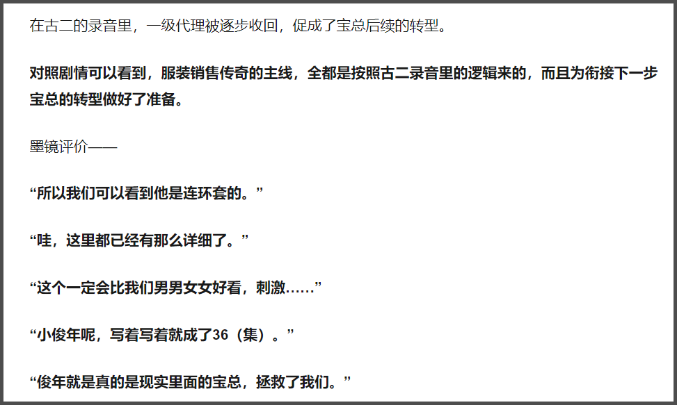 其后径直清除和秦雯换取了,安排古二把剧情干线写出来,然后给秦雯。还帮秦雯和古二说情,预料是秦雯当今没心想去看重写商战,让古二把桥段写好,等秦雯出差追思径直给她。