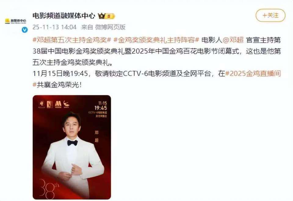 电影频谈融媒体中心幽静晓示,邓超将担任第 38 届中国电影金鸡奖授奖仪式的主握东谈主。这已是他第五次站在这一国度级电影盛典的舞台上。