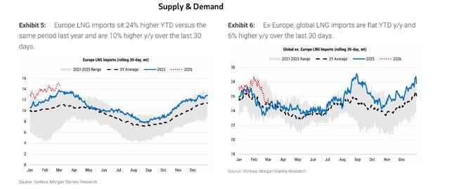 基准状态(快速平息):摩根士丹利以为这次中断转眼。跟着面孔精炼,JKM将回落至10至11好意思元/百万英热单元,并在改日数月进一步跌回10好意思元以下,与该行此前预测一致。现时基本面偏宽松——冬季需求岑岭已过,3月天气预告顺心,Golden Pass首批LNG亦行将投产。
