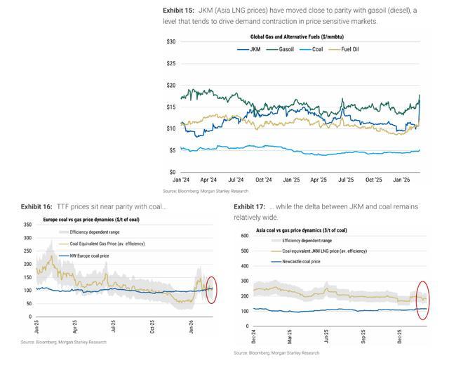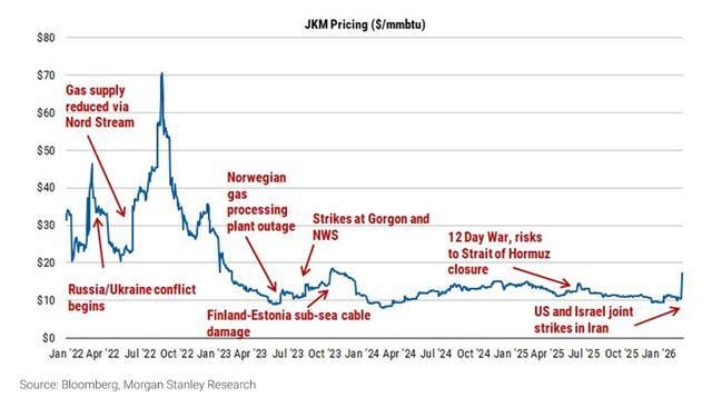 华尔街见闻此前说起,伊朗对卡塔尔Ras Laffan中枢分娩举止发动紧要后,卡塔尔动力公司(QatarEnergy)负责告示暂停LNG分娩。与此同期,霍尔木兹海峡油轮通行大范围受阻,石油、深广家具及LNG运载均受牵缠。JKM价钱速即攀升至约16至17好意思元/百万英热单元。据追风交往台音尘,摩根士丹利Devin McDermott团队3月2日发布推崇,以为这一涨幅与商场对1至2周转眼中断的预期相符,咫尺价位略高于2025年6月"十二天干戈"技术的峰值。